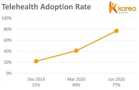 This recovery can be attributed to a great extent to telehealth. At that same time, one could say that the adoption of telehealth by independent practices was propelled forward five years by the pandemic. In 2019, a Kareo report showed the adoption rate of telehealth at only 22%. That